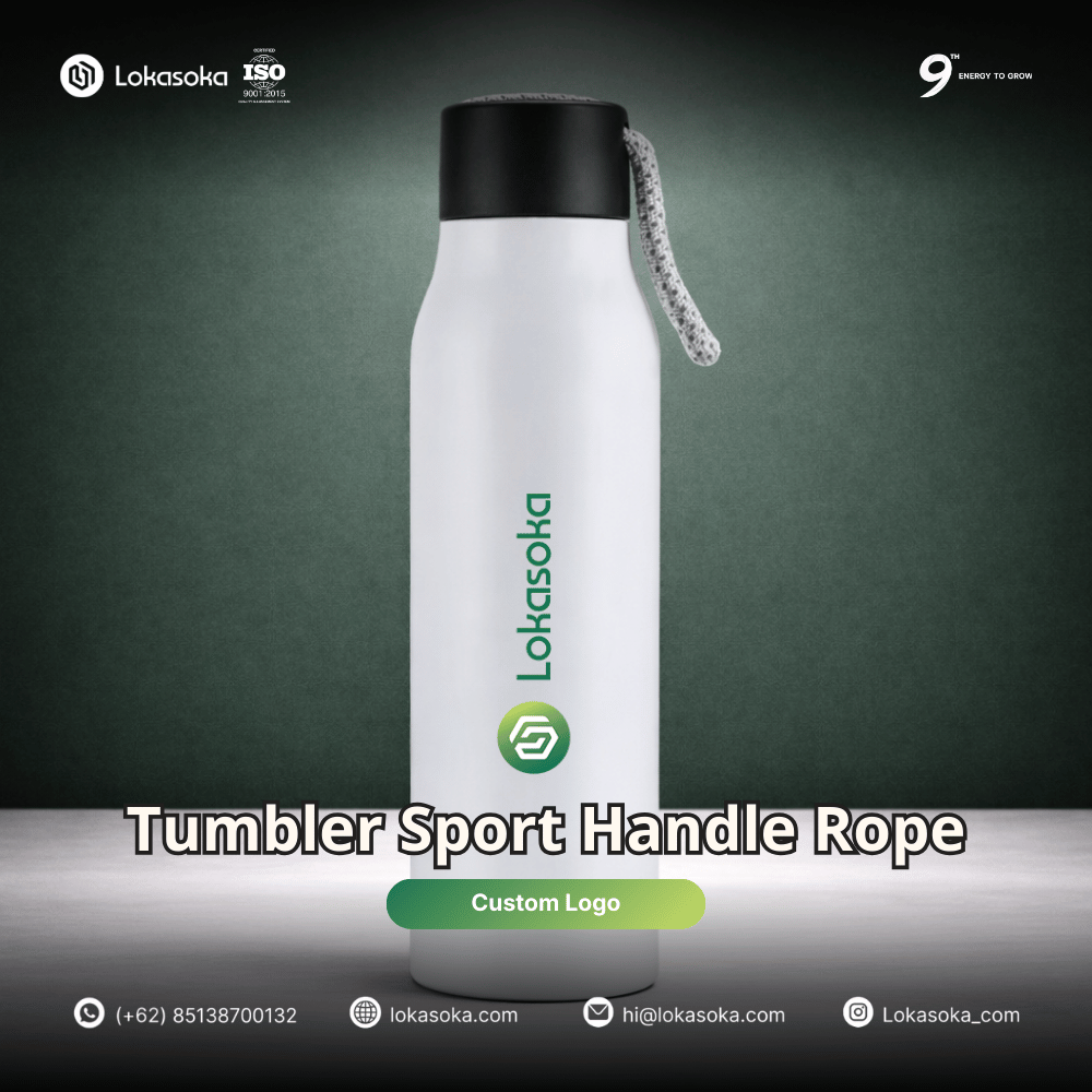 Selain model carabiner, ada juga tumbler dengan handle rope yang memudahkan siswa membawanya saat beraktivitas. Model ini cukup populer karena praktis dan nyaman digunakan sehari-hari.