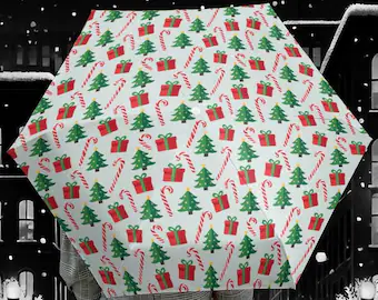 Selain ornamen, Anda bisa menggunakan ilustrasi bertema Natal, misalnya Santa Claus, rusa kutub, atau kado Natal. Dekorasi payung Natal ini bisa dicetak full-print atau hanya di beberapa bagian payung saja.