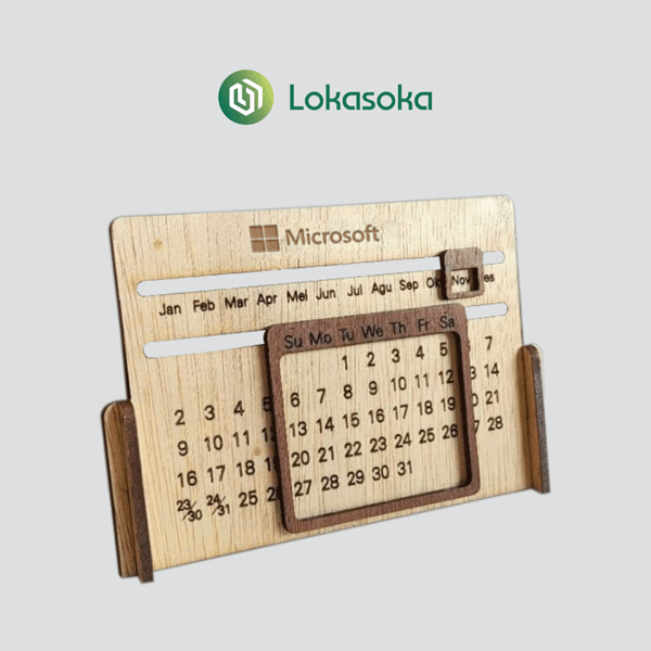 Bagi yang menyukai sentuhan natural dan ramah lingkungan, kalender meja kayu bisa jadi pilihan. Dengan ukiran logo brand, desainnya terlihat sederhana sekaligus memberi kesan eco-friendly.